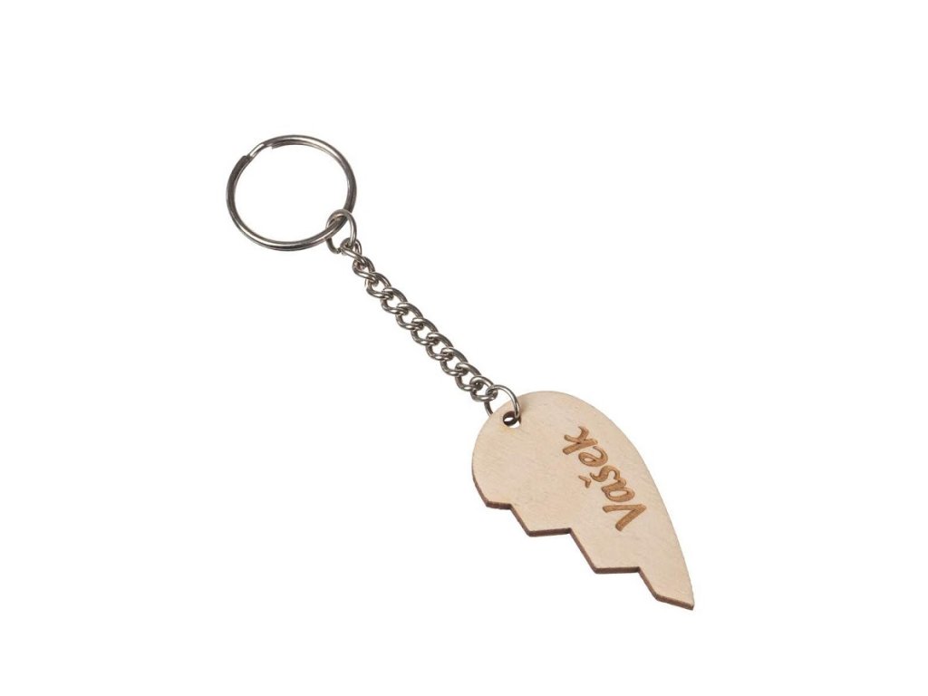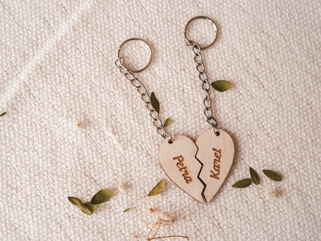 Drevené prívesky vyrezané z preglejky s vlastnými menami. Vhodné ako darček pre drahú polovičku, prívesok na tašku alebo ako kľúčenka.