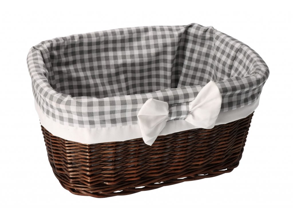 Štýlový košík z lúpaného prútia, vystlaný ozdobnou látkou s mašľou. Tento košík vám bude závidieť každá návšteva.