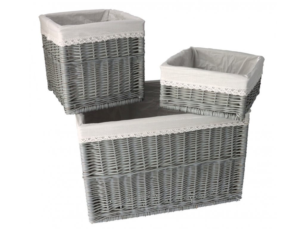 Dizajnový trojdielny set košíkov z lúpaného prútia v šedej farbe vystlaný bielou látkou s ozdobnou čipkou, ktorý ukryje množstvo vecí z vašej domácnosti. Tento krásny prútený set vám bude každá návšteva závidieť.