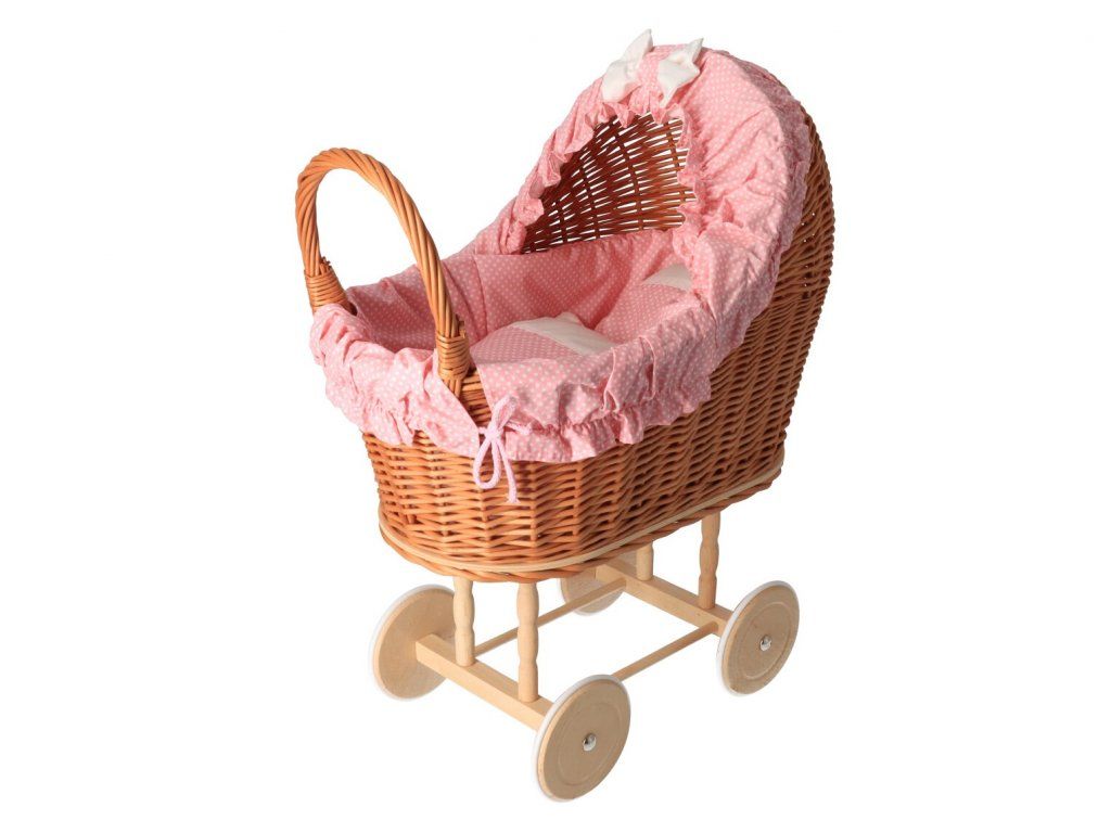 Kombinácia čerstvého dreva a prútia je pre detské hračky ideálna. Spolu s krásnou látkou bude tento kočík ladiť ku každej bábike vašej malej princeznej.