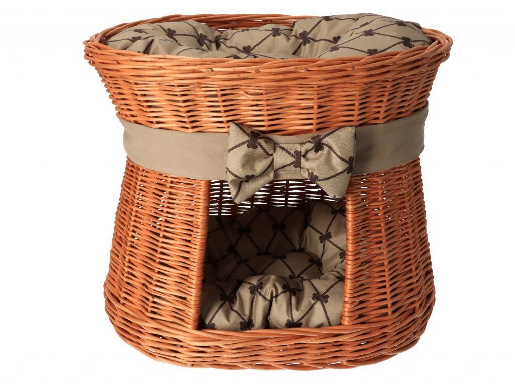 Prútený pelech s búdou prírodný - obšitý béžovou mašľou