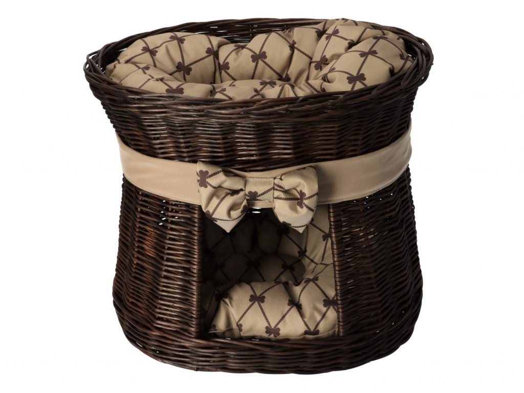 Prútený pelech s búdou tmavý - obšitý béžovou mašľou