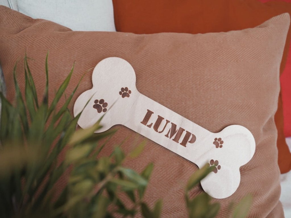 Hľadáte pre svojho psíka originálnu dekoráciu na mieru? Drevená menovka v tvare kosti mu ozdobí jeho pelech alebo kútik s miskou.
