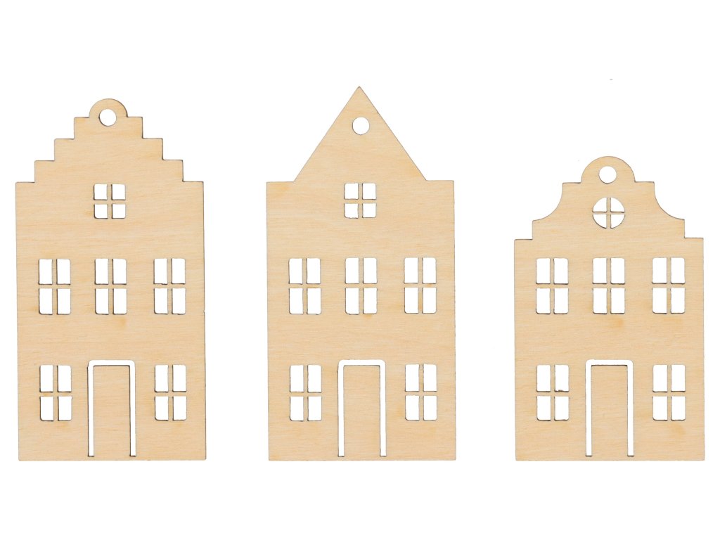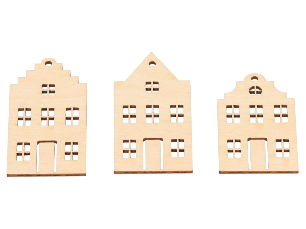 Domčeky sú vyrobené z brezovej preglejky a každý má zhora otvor na zavesenie. V sade sú tri kusy, ktoré môžete využiť ako minimalistickú a elegantnú ozdobu na stromček počas vianočných sviatkov alebo ako celoročnú hygge dekoráciu.
