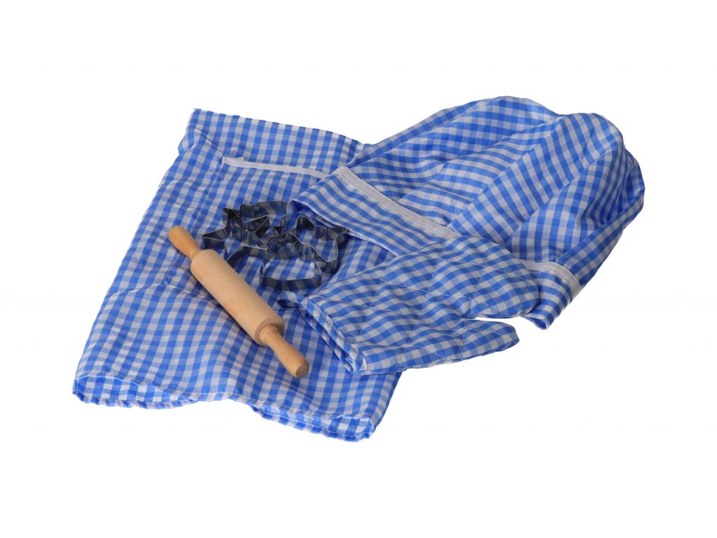 Sada pre malého šéfkuchára obsahuje krásnu modrú zásteru, chňapku, kuchársku čapicu a základnú sadu kuchárskeho náčinia.