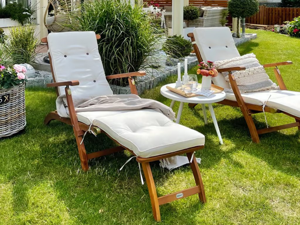 Variabilné ležadlo z masívneho akáciového dreva ponúka vysoký komfort sedenia vďaka nastaviteľnému operadlu a pohodlnej podnožke. Podnožku je možné jednoducho odňať, takže ležadlo ľahko premeníte na pohodlnú stoličku.