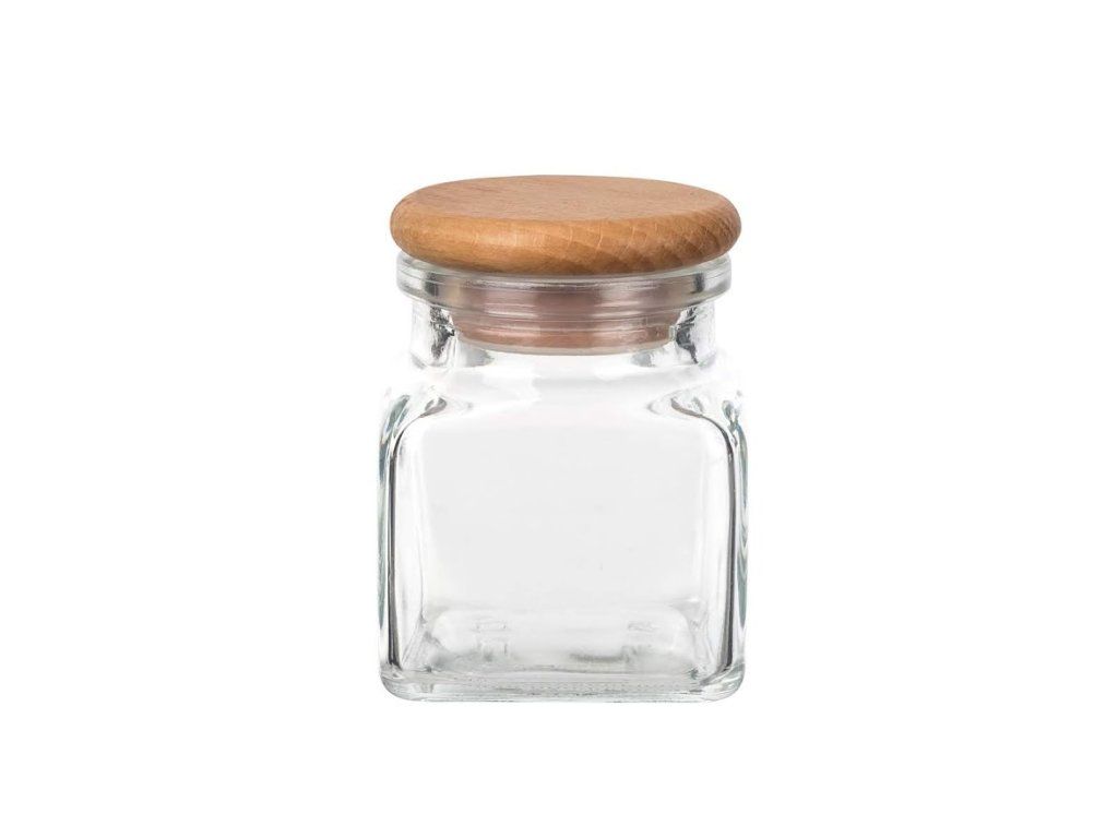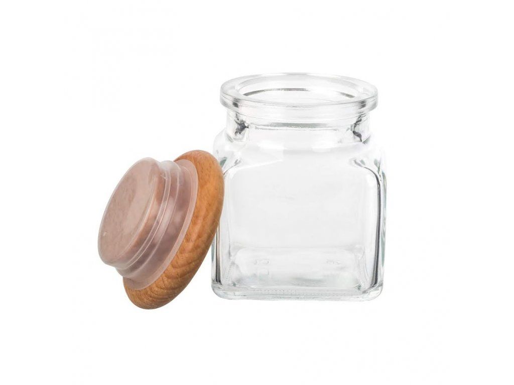 Sklenená korenička má viečko z bukového dreva, ktoré je opatrené presne padnúcim tesnením.