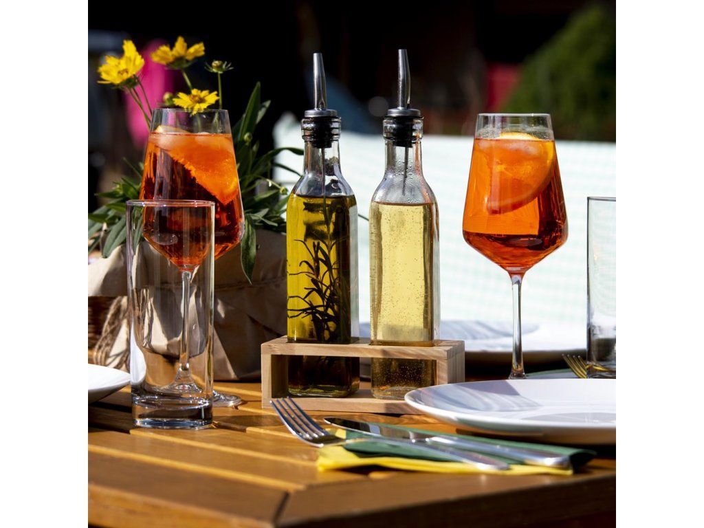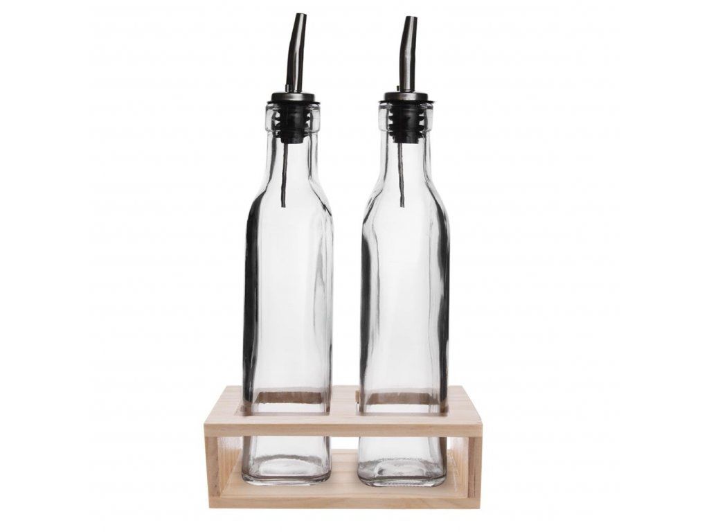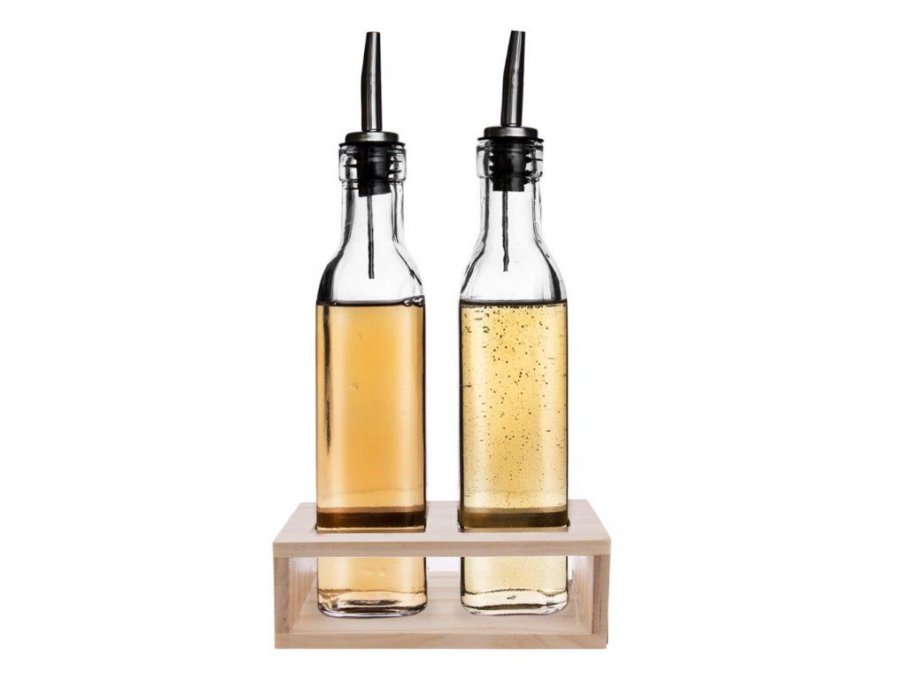 Súprava na dochucovanie v drevenom stojane umožňuje mať olej a ocot vždy poruke ako doma, tak aj na záhrade, či v reštaurácii.