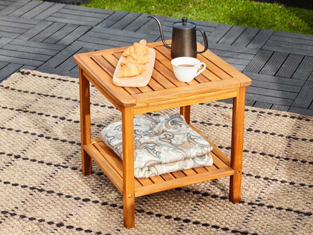 Elegantný odkladací stolík je vyrobený z predom olejovaného a poveternostným vplyvom odolného akáciového dreva. Stolík disponuje praktickou spodnou odkladacou policou, ktorá poskytuje ďalší úložný priestor na knihy, dekorácie alebo drobnosti. Vďaka univerzálnemu dizajnu sa hodí do záhrady, na terasu, balkón aj do interiéru.