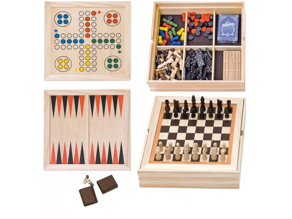 Niekoľko stolných hier v jednej krabičke - šachy, dáma, človeče nehnevaj sa, backgammon, mlyn, go pre domino a karty.
