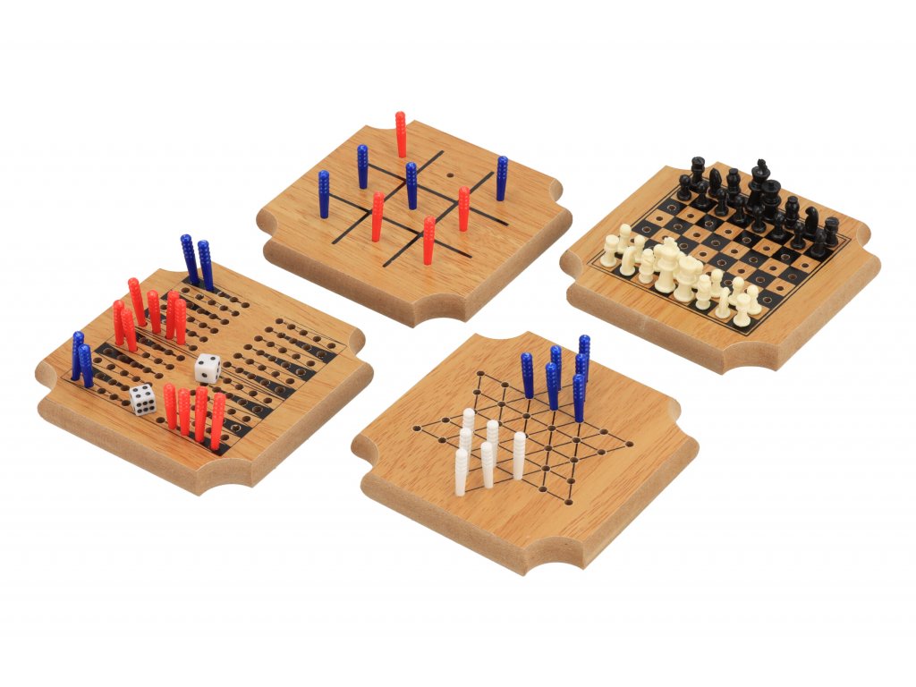 Súprava 4 podtáckov a stolných hier, s ktorou si užijete veľa zábavy! Otočte podtácok a uvidíte, aká hra sa pod ním skrýva. Zatiaľ čo si budete vychutnávať drink s priateľmi, môžete si zvoliť, či si zahráte šach, piškvorky, vrhcáby alebo napríklad čínsku dámu.