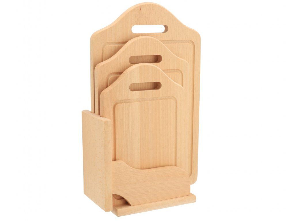 Súprava 3 obdĺžnikových dosiek rôznych veľkostí s drážkou v pevnom stabilnom stojane perfektne poslúži v každej kuchyni. Krájanie, porciovanie, servírovanie - to všetko zvládnu úplne s prehľadom.