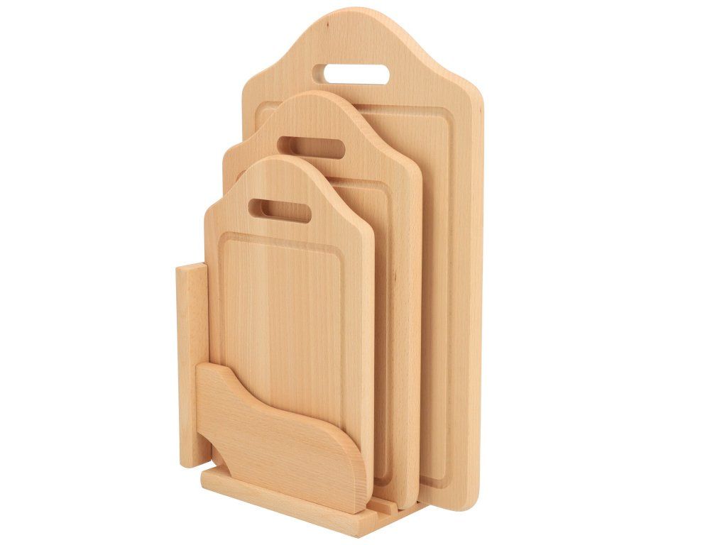 Sada 3 rôznych veľkých dosiek vyrobených z masívneho bukového dreva, ktoré oceníte pri krájaní alebo servírovaní. Netupí nože a má praktický stojan.