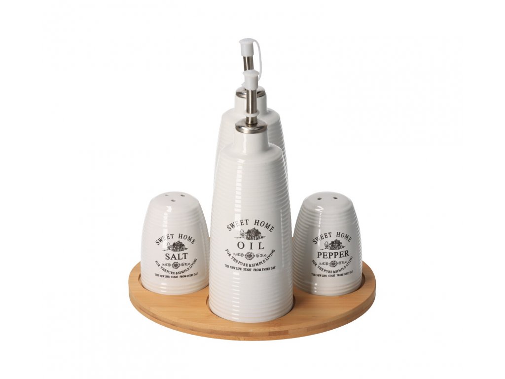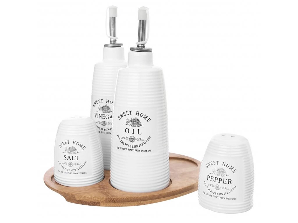 Súprava na dochucovanie na drevenom podnose, v ktorej uložíte olej, ocot, soľ i korenie a budete mať pri varení všetko pekne poruke.