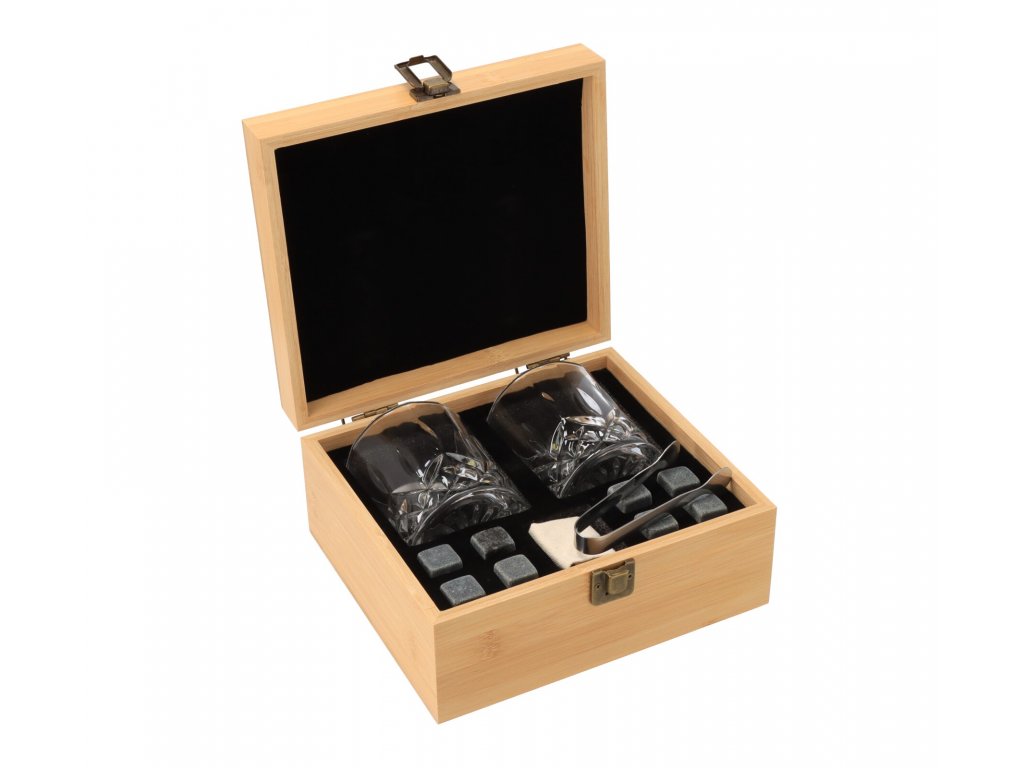 Luxusný set v bambusovej darčekovej krabičke na whisky, gin, mojito alebo iné nápoje. Obsahuje 2 poháre, 8 opakovane použiteľných kamenných kociek ľadu s úložným bavlneným vreckom a kliešťami.