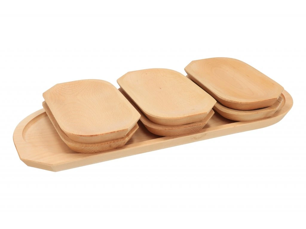 Bukové misky sú skvelým a originálnym riešením, ako štýlovo servírovať pochutiny návšteve. Súprava sa skladá z jednej veľkej a šiestich malých misiek.