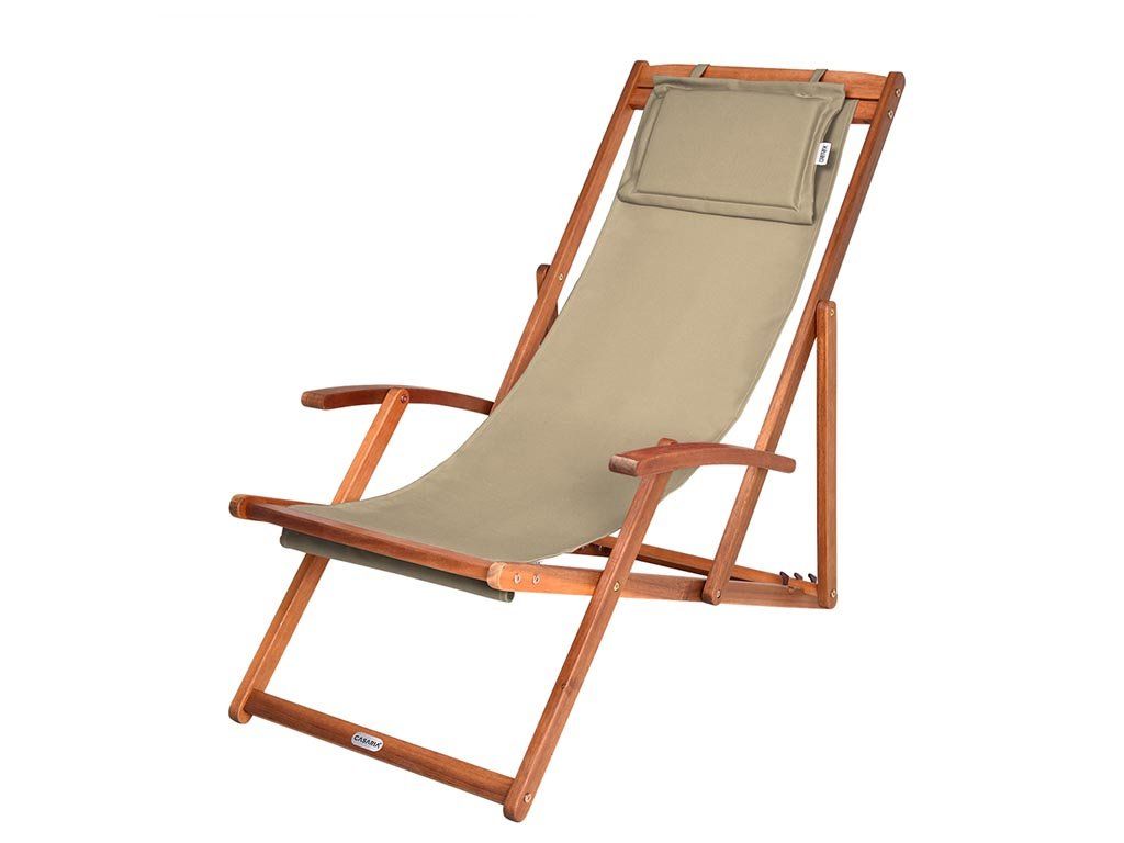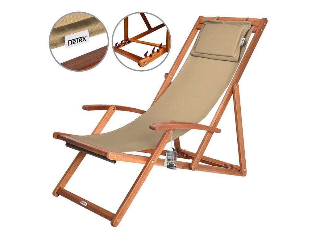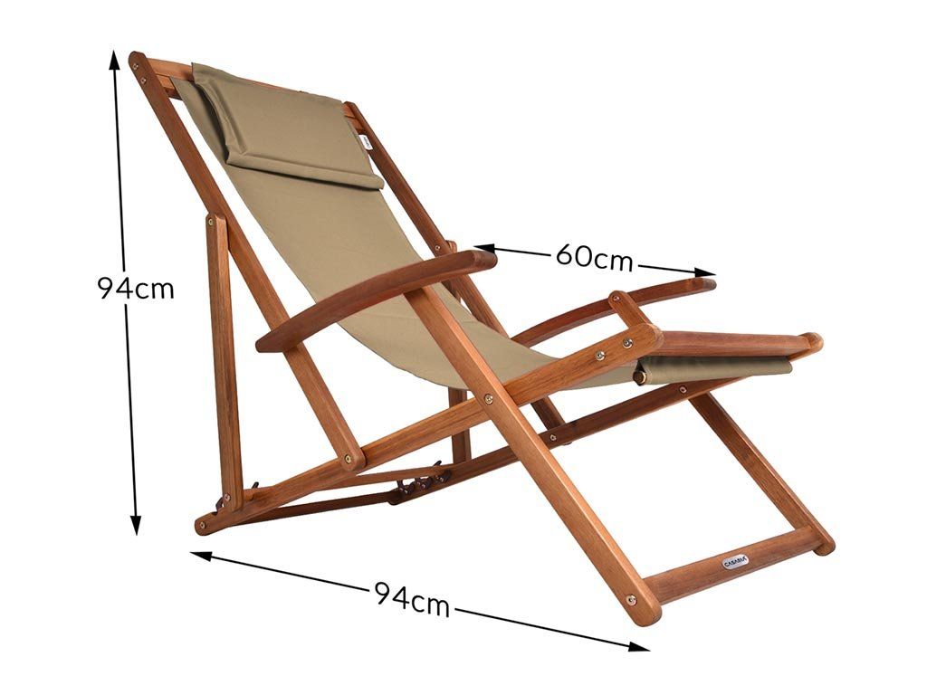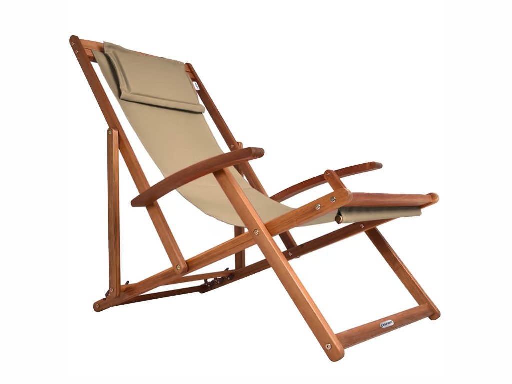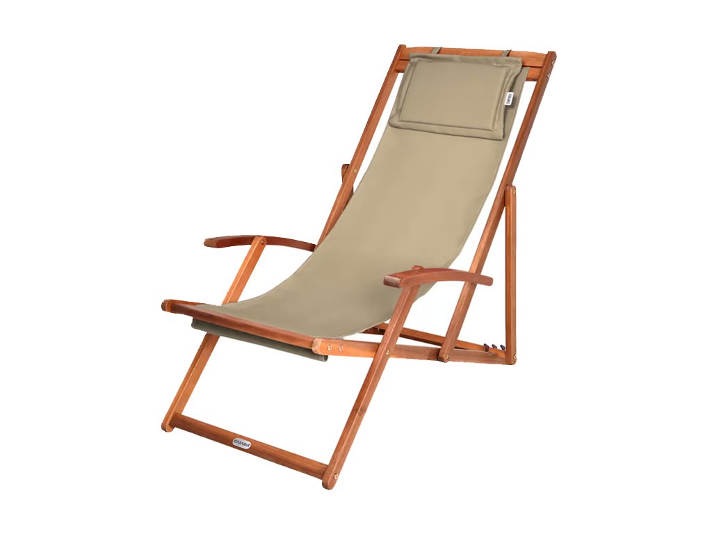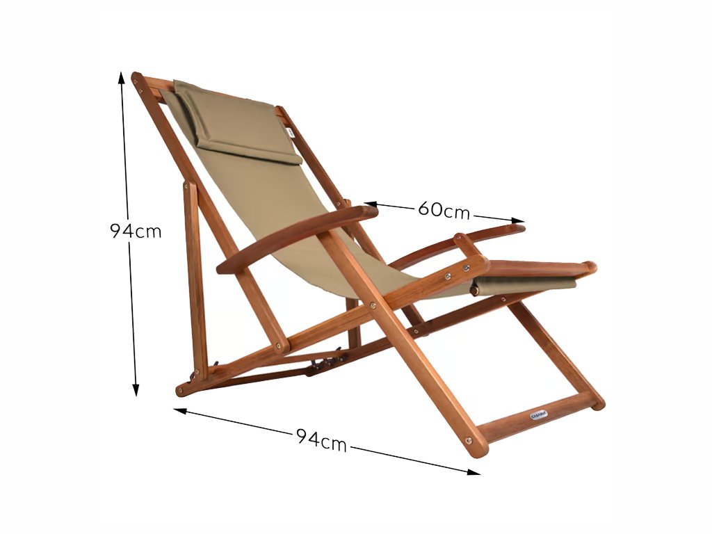 Ležadlo je nastaviteľné do 3 polôh a jednoducho skladacie, takže sa ľahko prenáša aj skladuje. Komfort zaisťujú opierky rúk a odnímateľný polstrovaný vankúš na hlavu so suchým zipsom. Priedušná textília sa prispôsobí telu a zabraňuje poteniu aj pri dlhšom sedení.