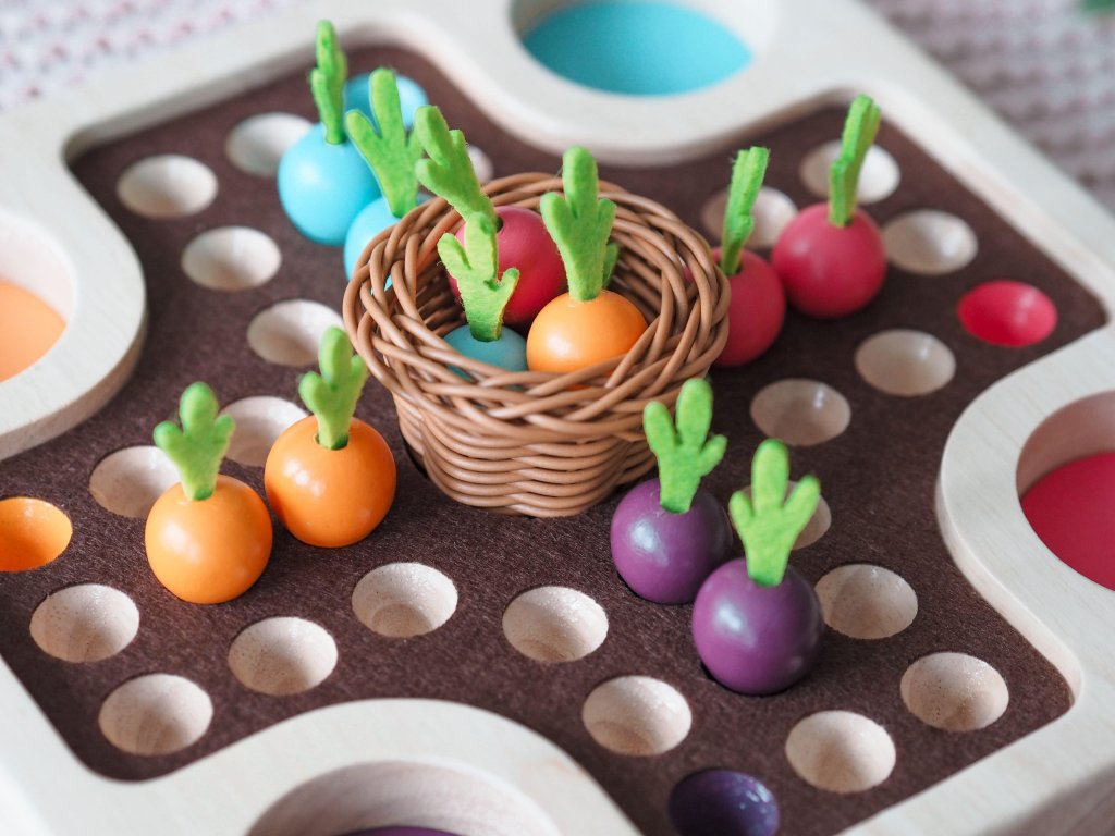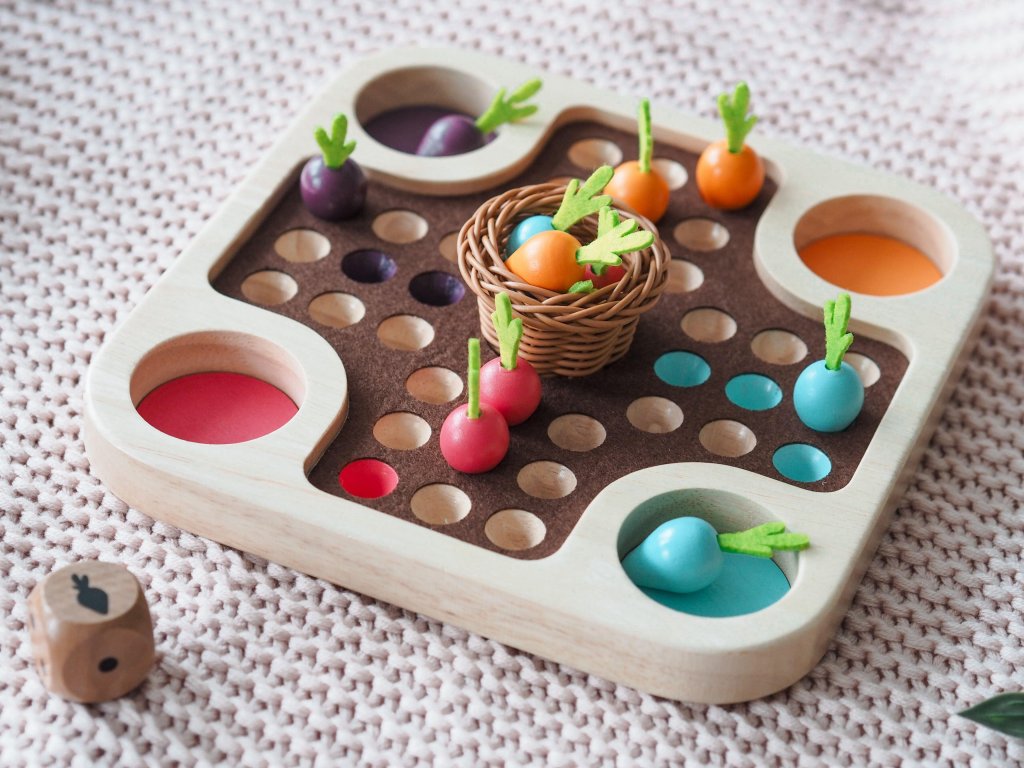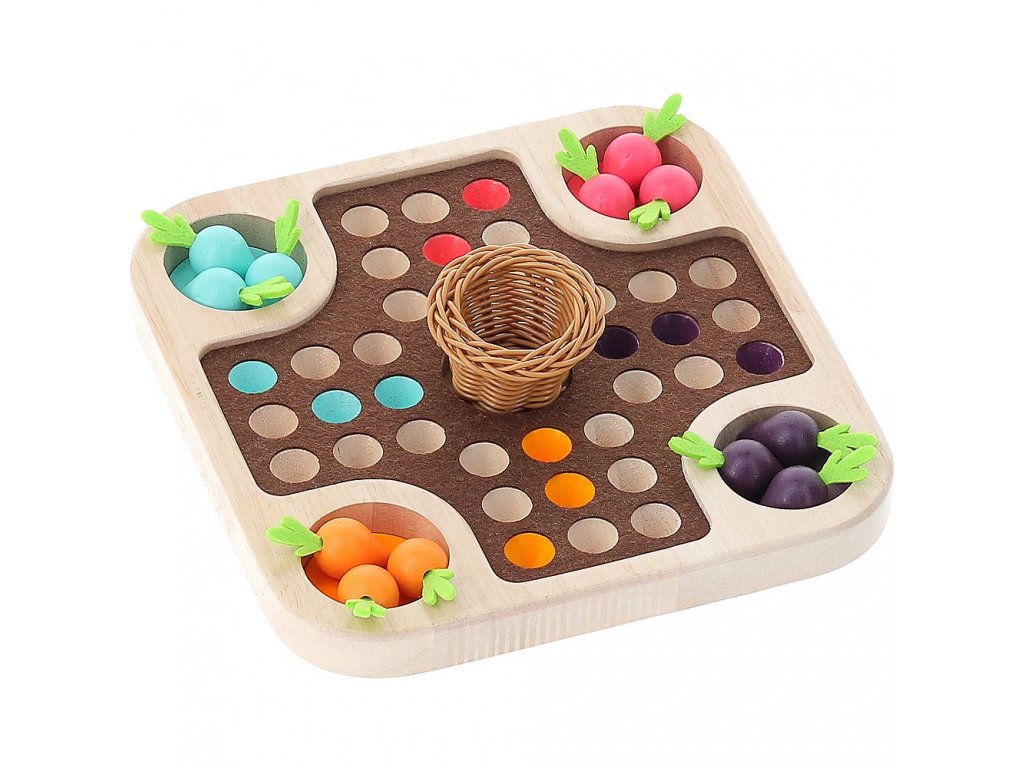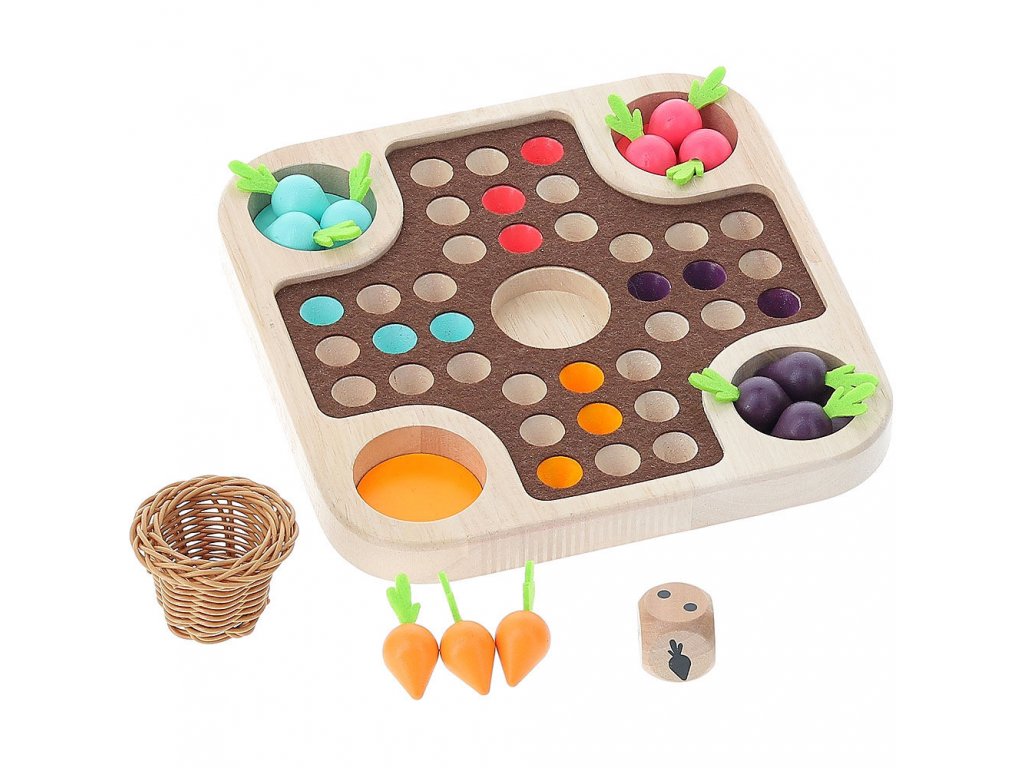 Tradičná hra človeče, nehnevaj sa v prírodnom dizajne je plná farebných mrkvičiek a košíčka uprostred. Veselá spoločenská hra je prispôsobená aj najmenším hráčom. Kto ako prvý dokončí zber zeleniny a vyhrá?